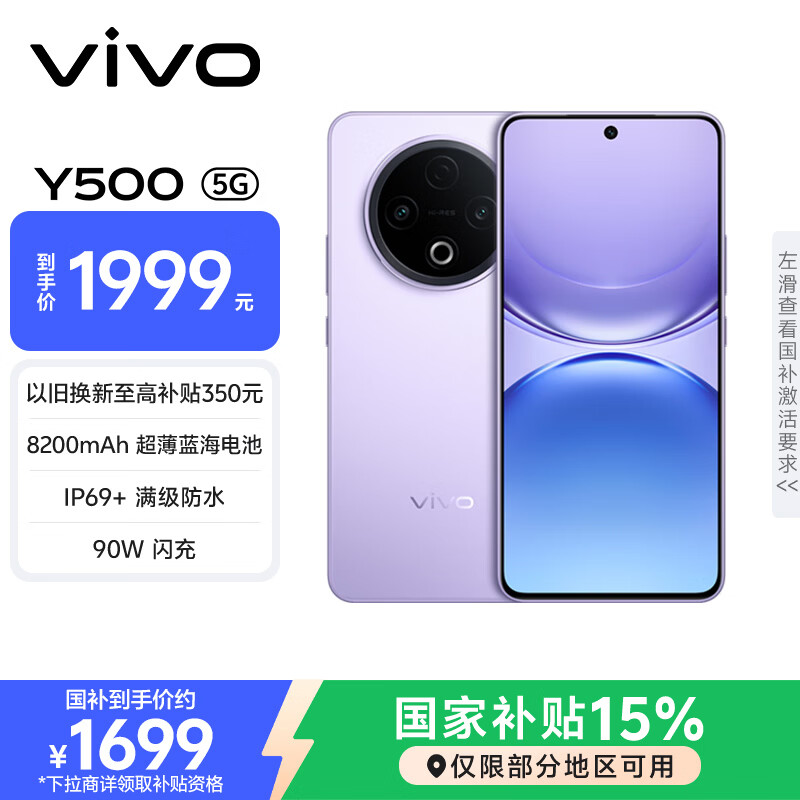 vivo Y500 12GB+512GB 龙晶紫 8200mAh超薄蓝海电池 IP69+满级防水 越级旗舰外观 耐用抗摔 AI手机
