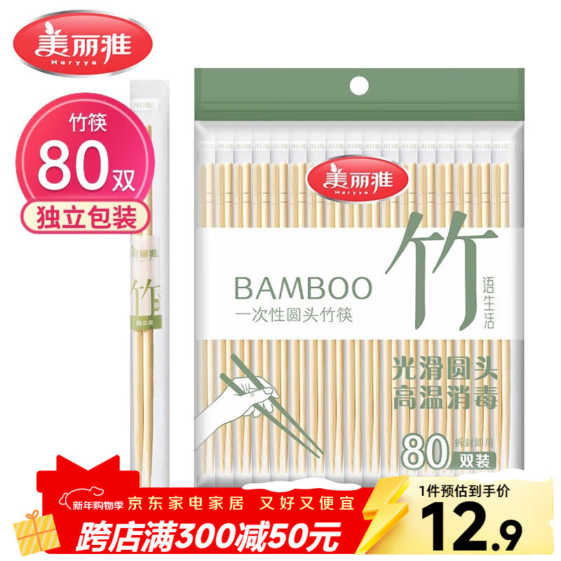 美丽雅一次性筷子独立包装80双 竹筷方便筷家用快餐方便外卖餐具