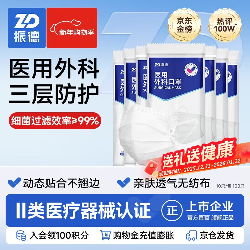 振德一次性医用外科口罩白色成人儿童透气防粉尘过敏鼻炎雾霾 100只