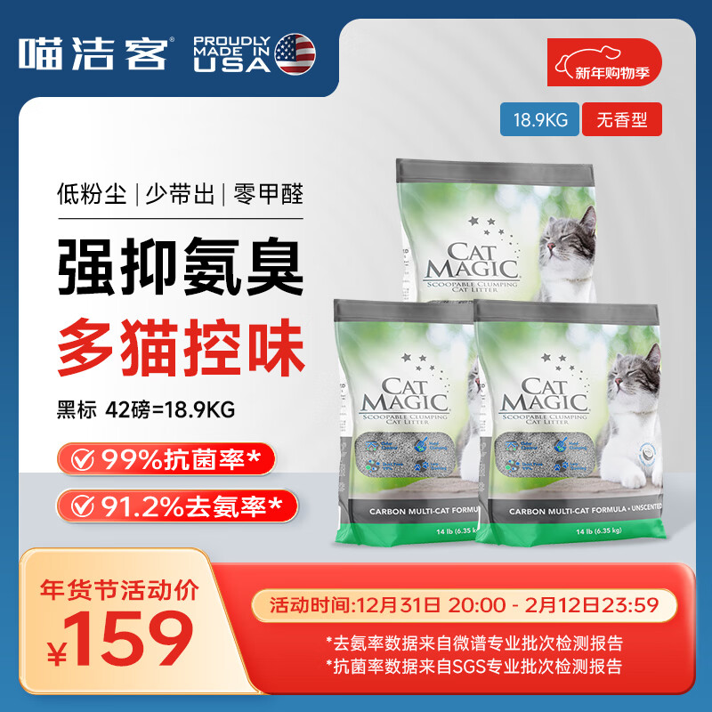 喵洁客(CAT MAGIC)猫砂美国原装进口矿砂钠基矿石抗菌去氨膨润土活性炭黑标42磅