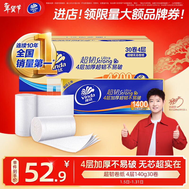 维达(Vinda)无芯卷纸 超韧4层140克*30卷 加厚升级 卫生纸厕纸 卷筒纸 整箱
