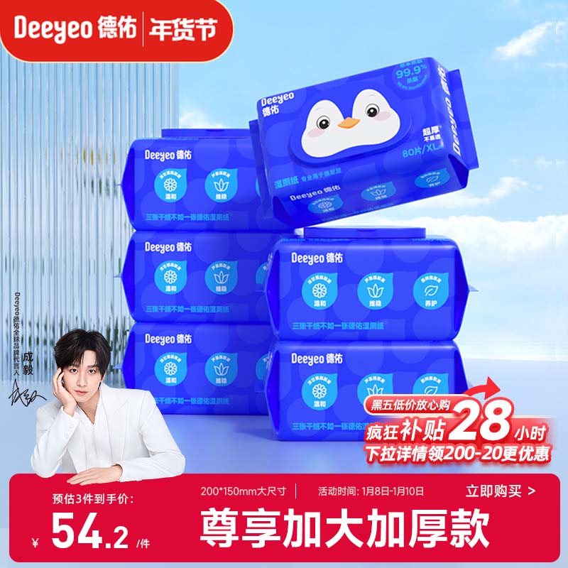 德佑企鹅湿厕纸加大加厚80抽*6包 杀菌厕纸如厕湿纸巾 湿厕纸可冲散