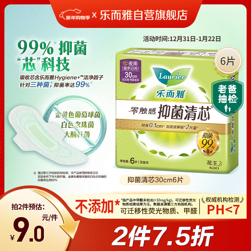 乐而雅花王零触感抑菌清芯夜用卫生巾30cm6片祛味姨妈巾京东自营新国标