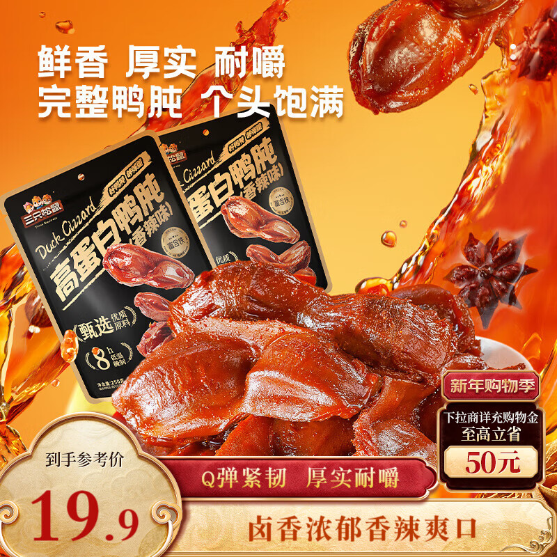 三只松鼠香辣鸭肫250g袋装休闲零食高蛋白卤味解馋约10小袋即食肉干肉脯