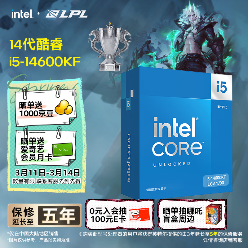 英特尔(Intel)酷睿14代 i5处理器14600KF 14核20线程 24M三级缓存 盒装台式机CPU 游戏办公剪辑