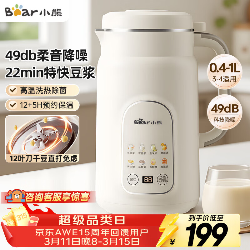 小熊(Bear)白月光豆浆机破壁机家用1L快豆浆大容量3-4人用全自动免煮多功能料理机榨汁机DJJ-H08C1