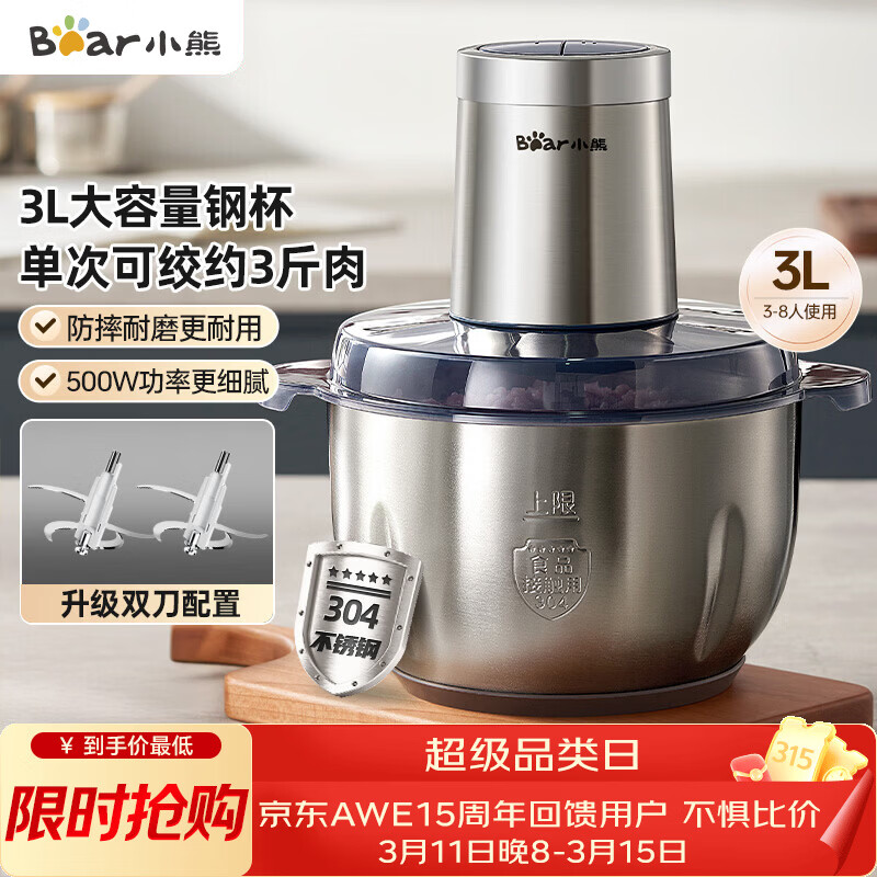 小熊(Bear)绞肉机家用 碎肉机电动搅拌机饺子肉馅蒜蓉机 搅肉机 绞肉绞菜多功能一体机 3L全钢杯 QSJ-P05E3