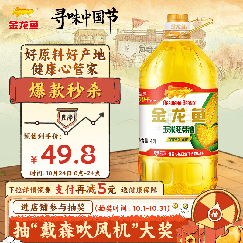 金龙鱼 食用油 非转基因压榨一级玉米胚芽油4L(新老包装随机发货)