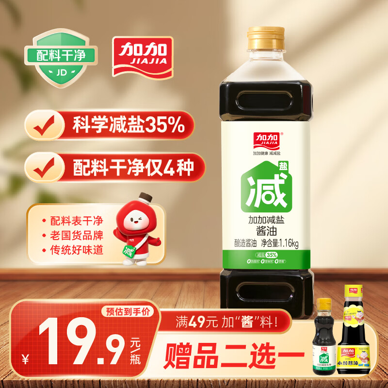 加加 减盐系列 减盐酱油1.16kg【特级生抽 减盐35%】0添加白砂糖