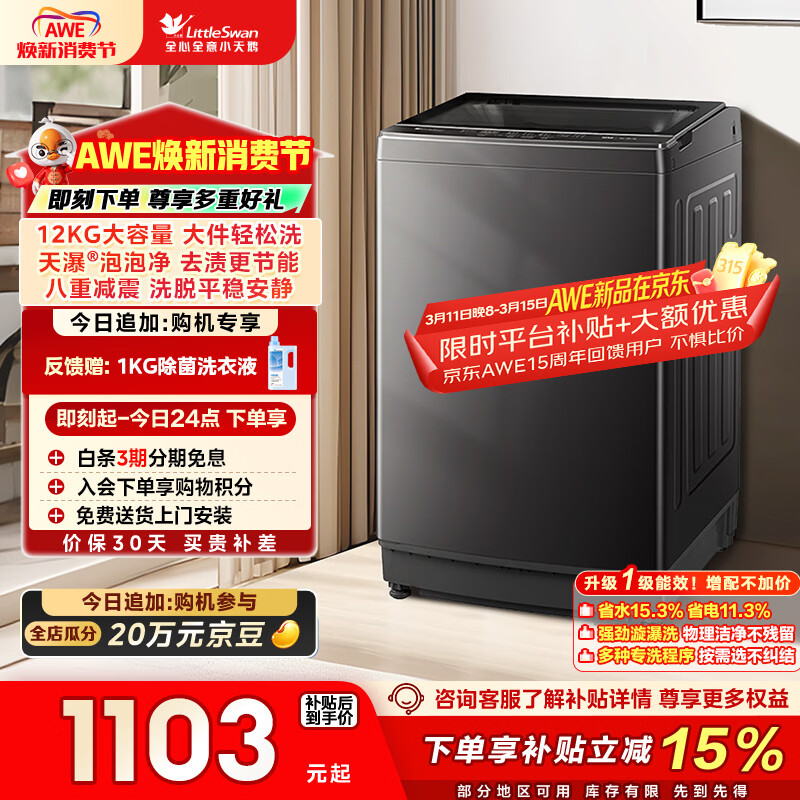 小天鹅(LittleSwan)波轮洗衣机全自动家用 12KG大容量 TB12-1809T 以旧换新 国家补贴 京东自营 一级能效