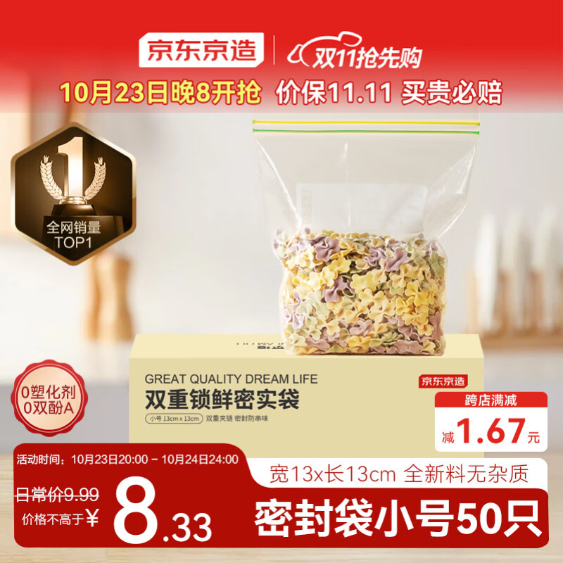 京东京造 密封袋食品级保鲜袋小号双拉链自封口露营烧烤13*13cm【50只】