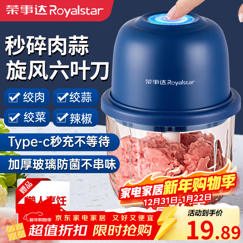 荣事达(Royalstar)蒜泥捣碎器电动拉蒜器蒜蓉搅碎器葱姜蒜粉碎器打蒜末神器多功能小型家用婴儿辅食料理绞肉机 深蓝- 0.3L 【四叶锋刀+Type-c闪充】