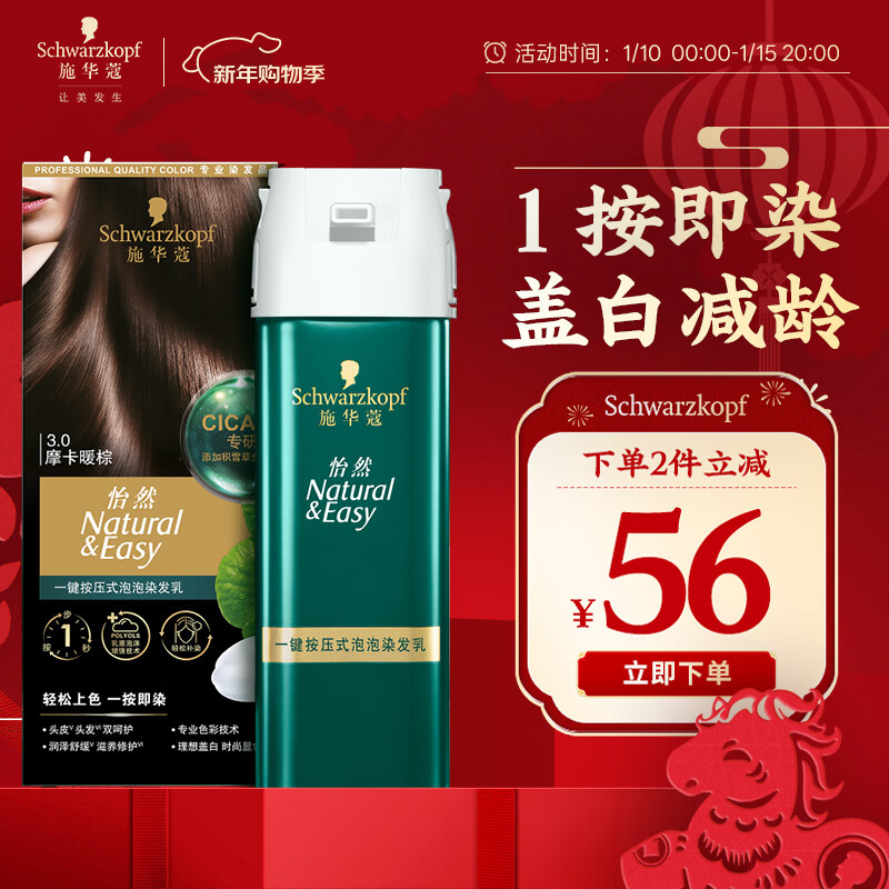 施华蔻(Schwarzkopf)怡然一按染泡泡染发乳3.0摩卡暖棕 染发剂轻松多次盖白赠发膜50ml