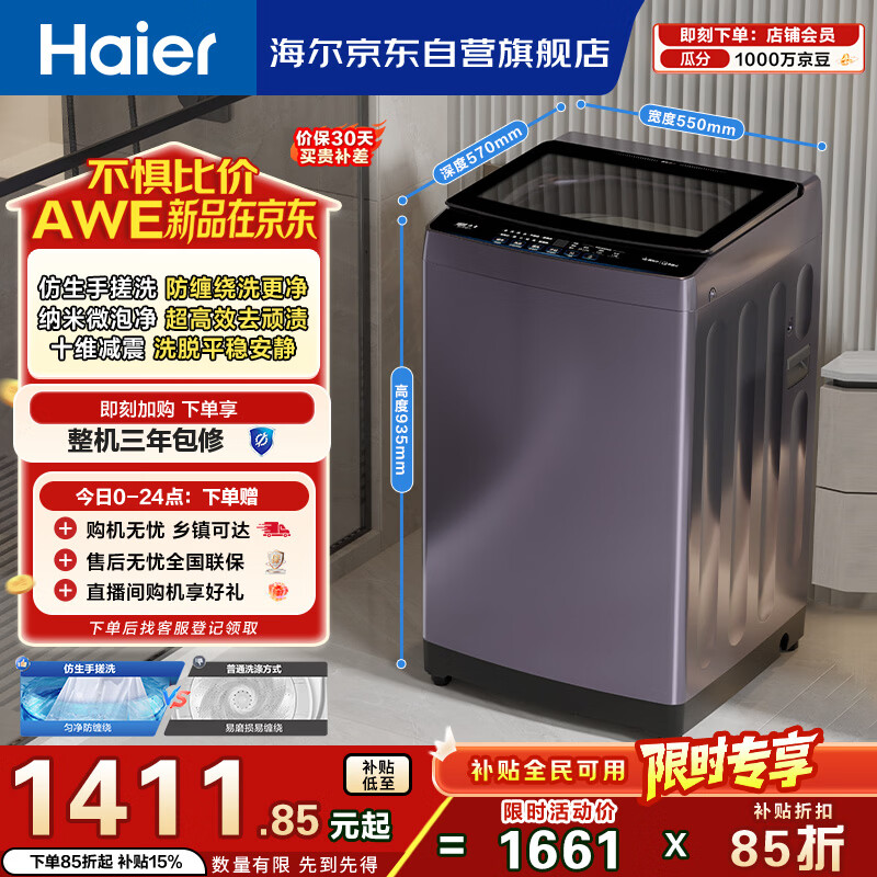 海尔(Haier)手搓洗 全自动波轮洗衣机 10KG直驱变频 除螨抗菌 一级能效 家电国家补贴京东自营 XQB100-BS629