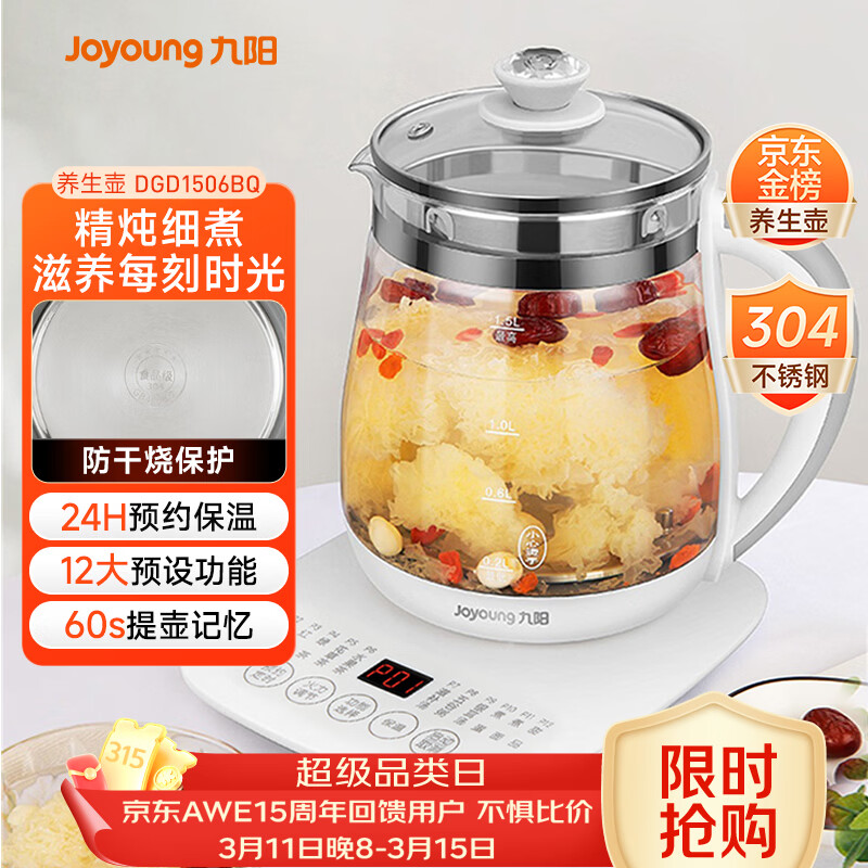 九阳(Joyoung)养生壶迷你玻璃花茶壶煮茶器 12大功能11档温度 0胶水恒温电热烧水壶1.5L 1506BQ