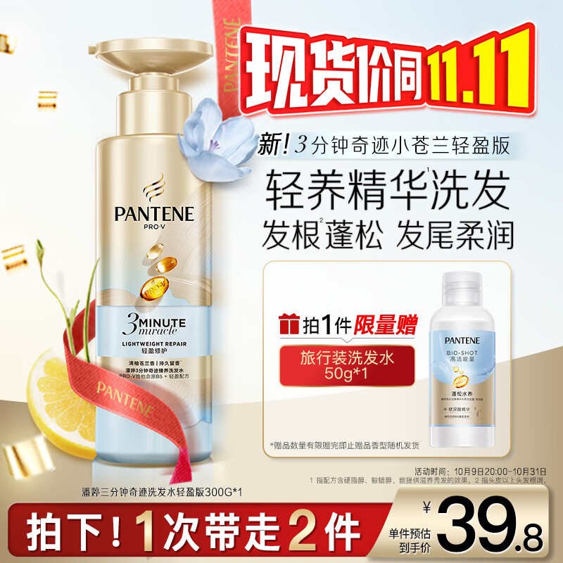 潘婷三分钟奇迹蓬松去油洗发水小苍兰留香300g洗头膏洗发露京东自营