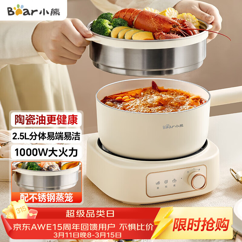 小熊(Bear)电煮锅 分体式电热锅 小电锅 电火锅 电蒸锅 学生宿舍多功能锅 蒸煮煎炒2-3人用 配蒸笼2.5L D25D1