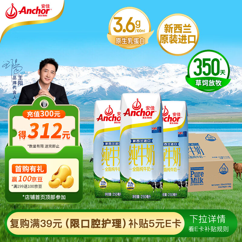安佳(Anchor)3.6g蛋白质 全脂牛奶 250ml*24盒 新西兰原装进口草饲