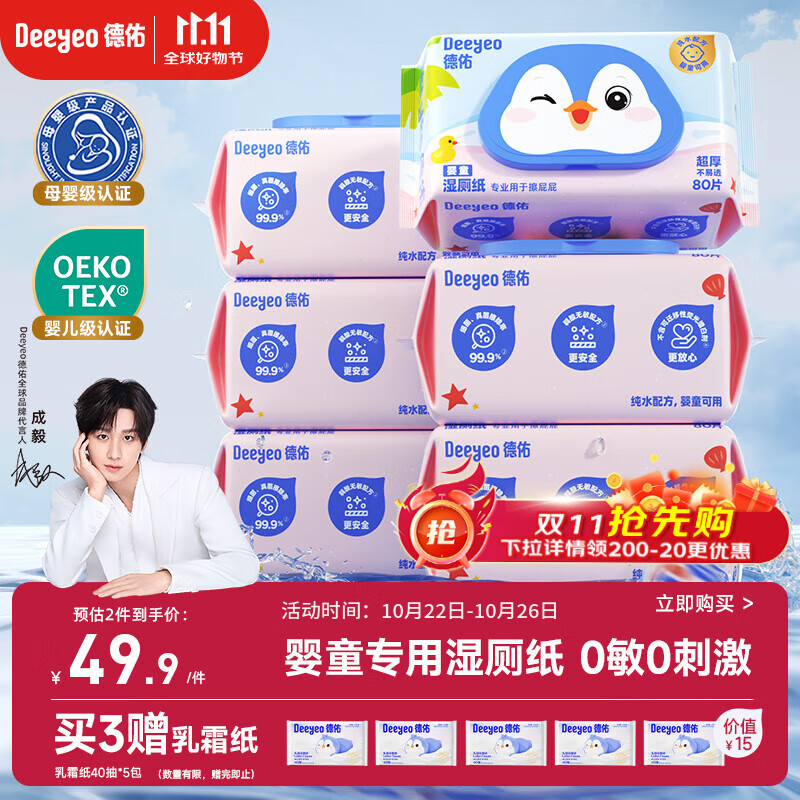 德佑婴童湿厕纸纯水80抽6包宝宝擦屁屁专用厕纸护臀0刺激加厚可冲马桶