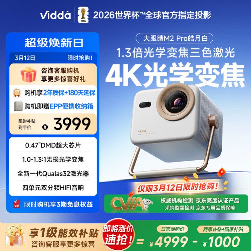 Vidda 大眼睛M2 Pro皓月白 海信4K超高清三色激光投影仪 无损光学变焦0.47DMD芯片家庭影院办公国家补贴