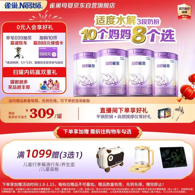 雀巢(Nestle)超启能恩3段适度水解配方奶粉 3倍DHA 12-36月加量装850g*4罐礼盒