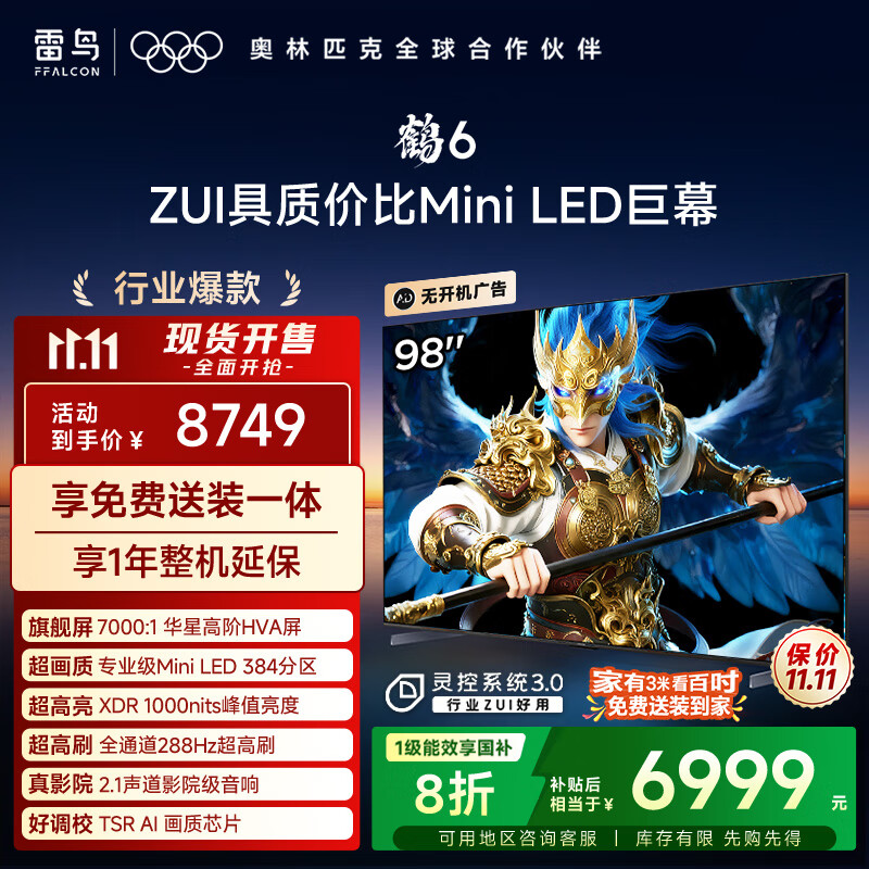 FFALCON雷鸟电视 98鹤6 98英寸 MiniLED 华星HVA 背光分区 家电国家补贴 98/100英寸电视98S595C