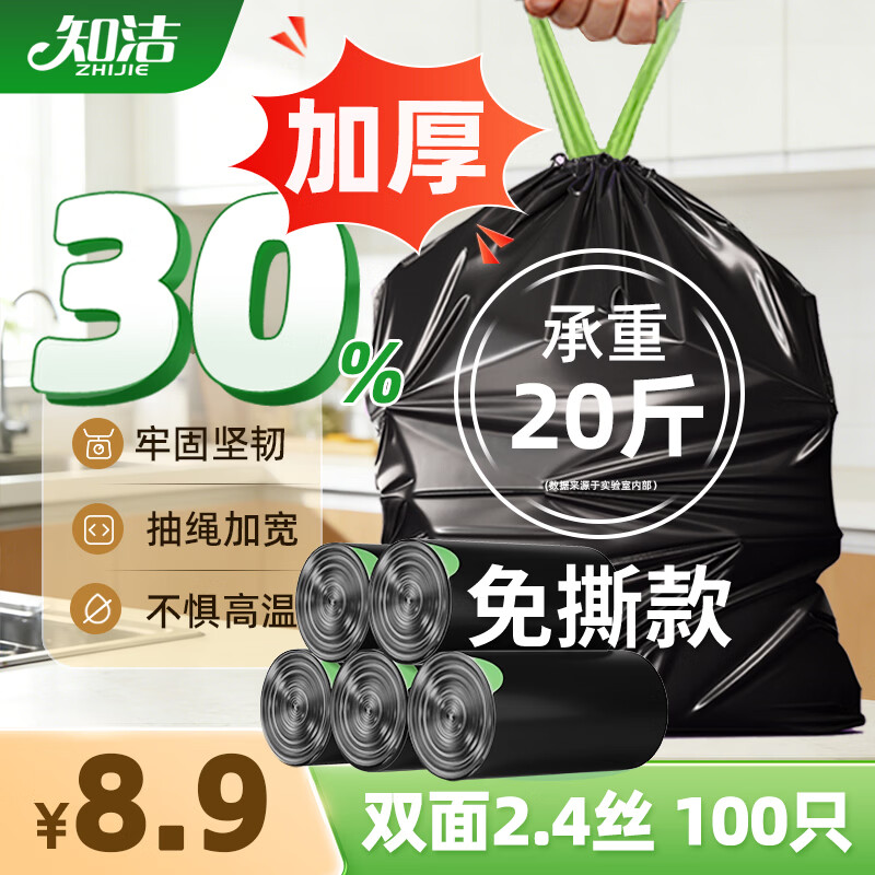 知洁抽绳垃圾袋黑绿45*50cm100只单面1.2丝家用手提穿绳免撕加厚塑料