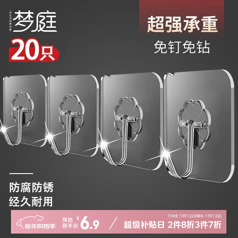 梦庭 挂钩 强力粘钩卫生间免打孔挂钩贴浴室门后贴墙挂衣钩 20只