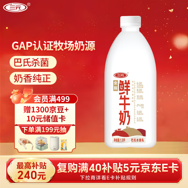 三元 全脂 鲜牛奶 1.8L 大桶家庭装 巴氏杀菌 早餐搭档
