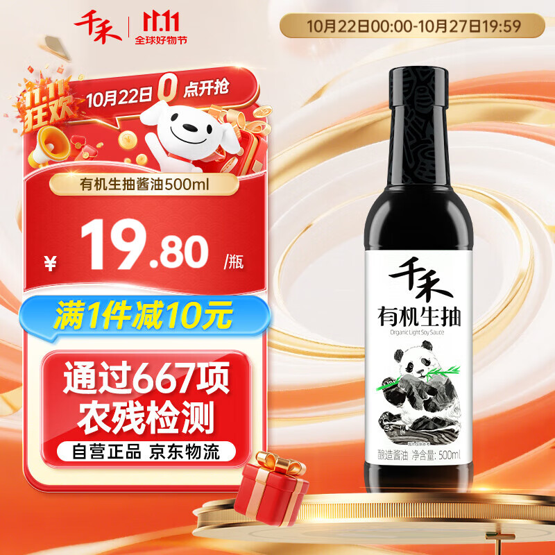 千禾有机酱油 500mL【有机 特级品质】零添加生抽家用蘸炒焖炖