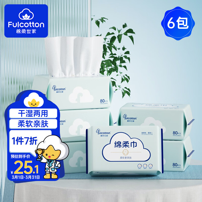 棉柔世家(FulCotton)棉柔世家婴儿绵柔巾【80抽*6包】洗脸巾干湿两用洁面巾宝宝擦脸巾