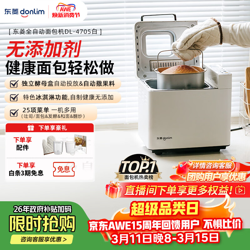 东菱(Donlim)升级款面包机 全自动家用和面机可预约智能双撒高成功率面包机和面机冰淇淋机DL-4705白色