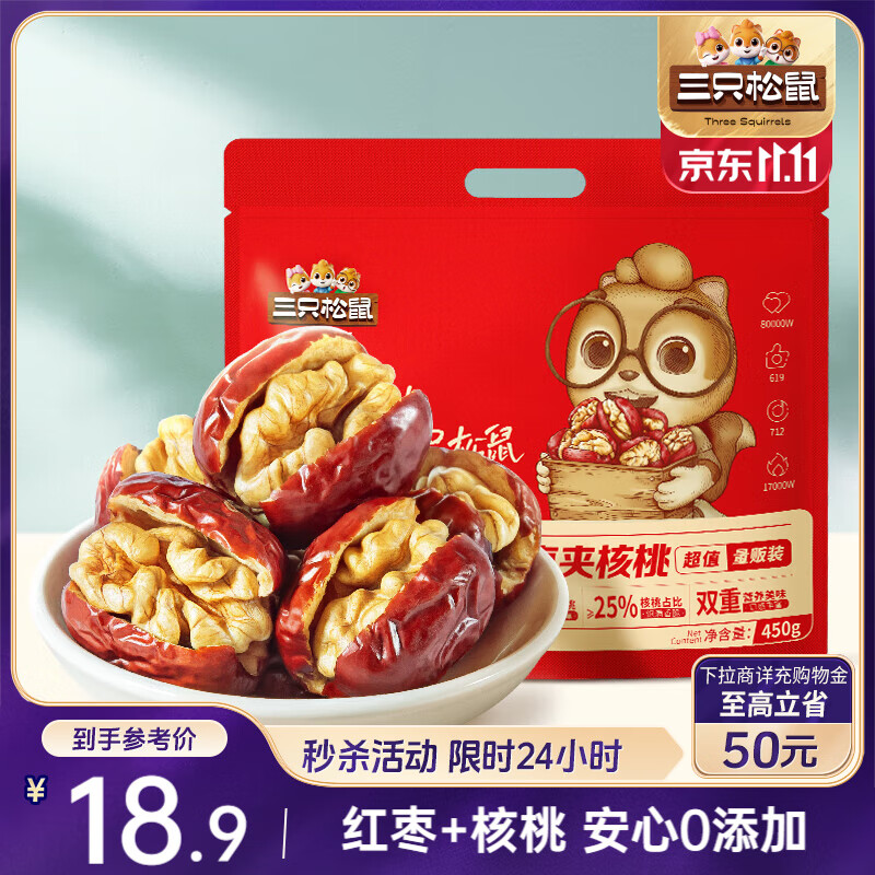 三只松鼠枣夹核桃450g红枣坚果核桃休闲零食新疆免洗大枣送礼约90颗