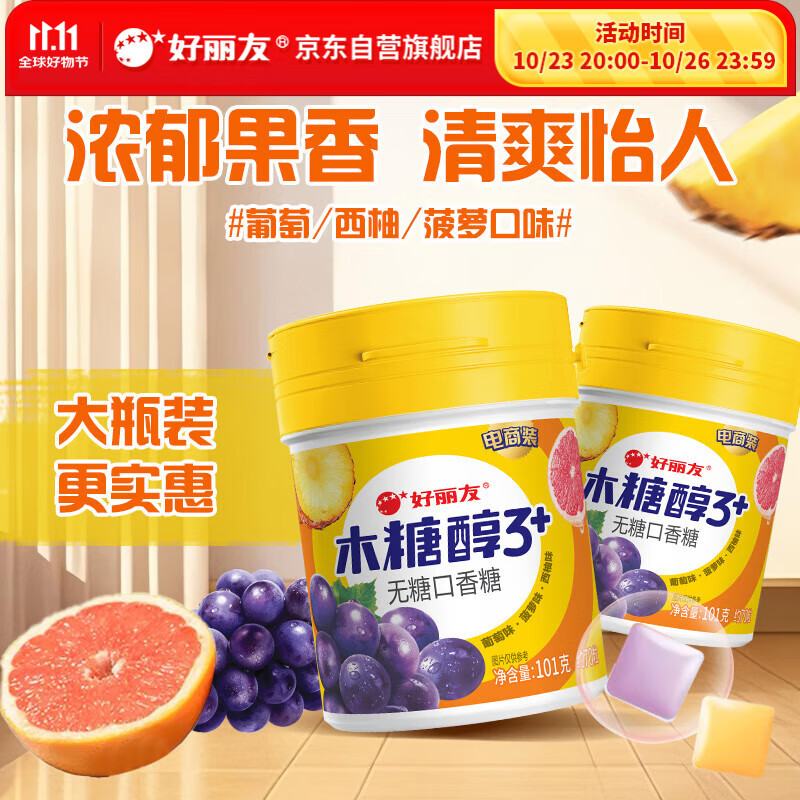 好丽友 无糖口香糖 葡萄/西柚/菠萝味 101g/瓶 休闲零食 清新 大瓶装