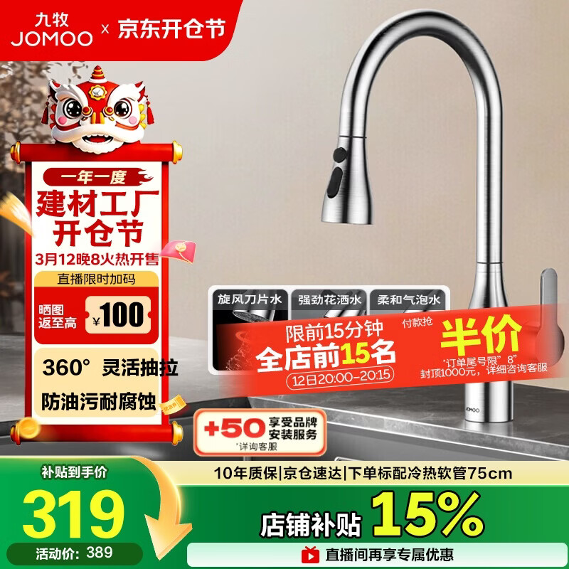 九牧(JOMOO)厨房水龙头冷热双控三功能抽拉304不锈钢水槽洗菜盆抽拉龙头33178