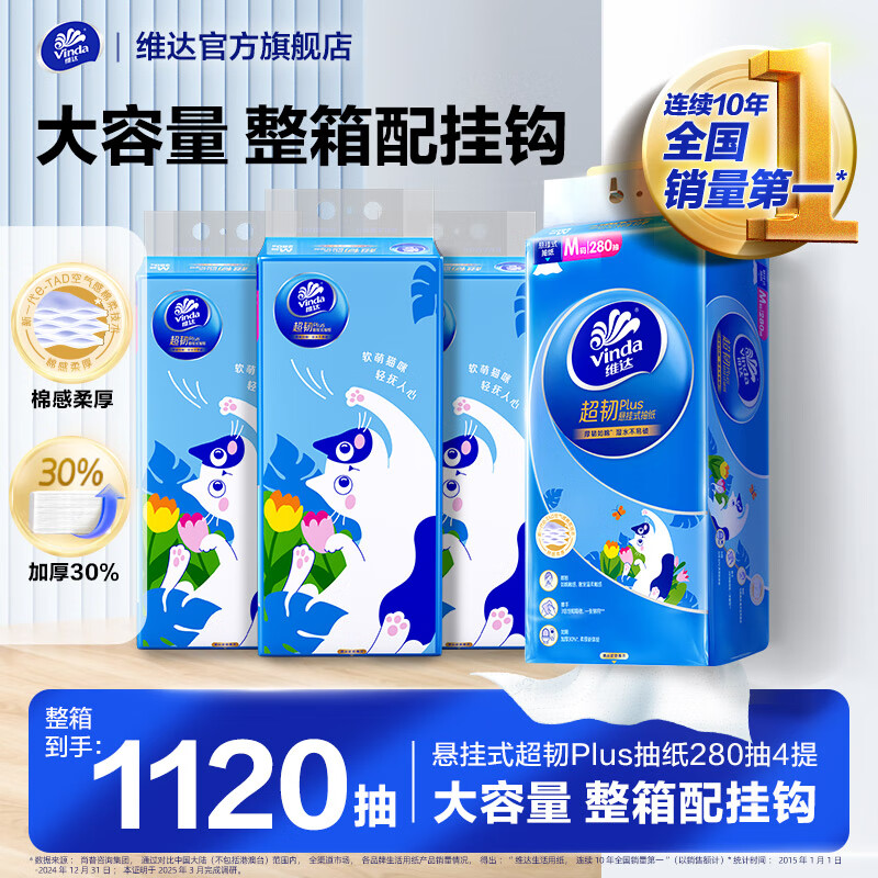 维达(Vinda)抽纸 超韧棉韧Plus挂抽悬挂式 马年新春款 加大加厚整箱 悬挂式整箱装
