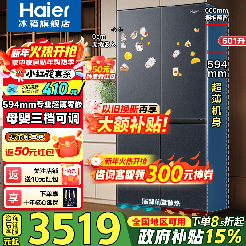 海尔(Haier)【小红花新品】501升594mm专业超薄零嵌入式十字对开门四门家用电冰箱风冷无霜底部散热补贴20% 501L+594mm超薄+底部散热+黑金净化