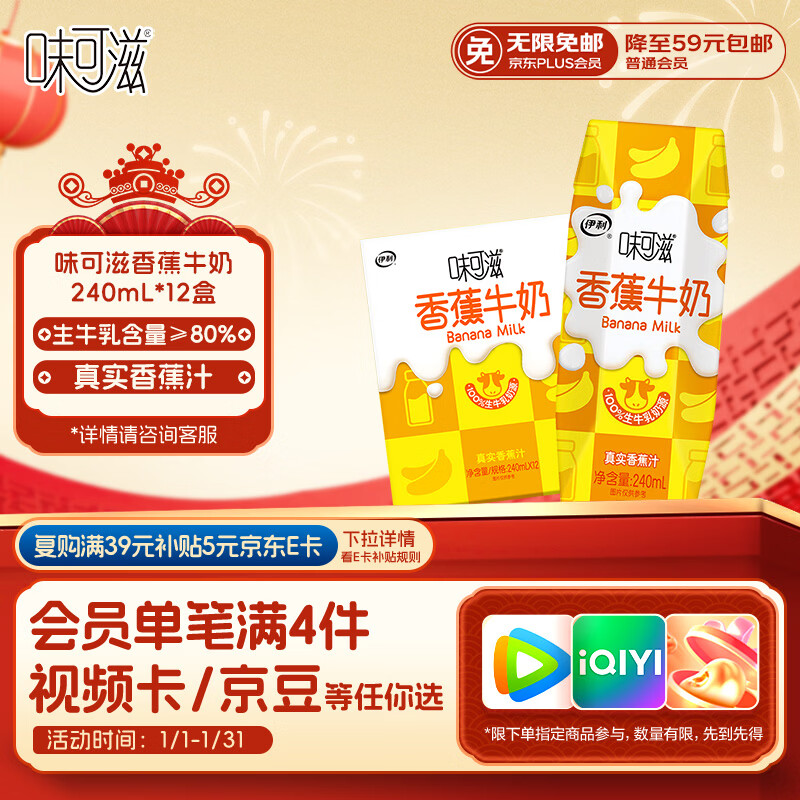 伊利味可滋 香蕉牛奶整箱240ml*12盒 包装随机(生牛乳制作)礼盒装