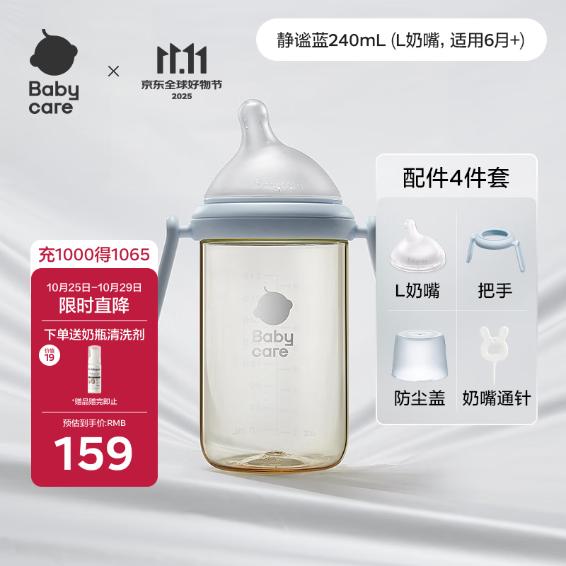 babycare歪头奶瓶仿母乳新生儿学饮杯PPSU耐摔L嘴 240ml静谧蓝