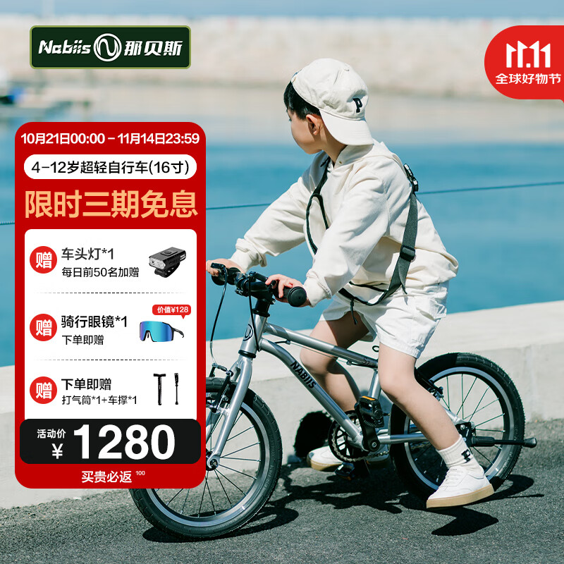 Nabiis那贝斯儿童自行车小孩3-6-7-8岁铝合金超轻便学生单车16寸银