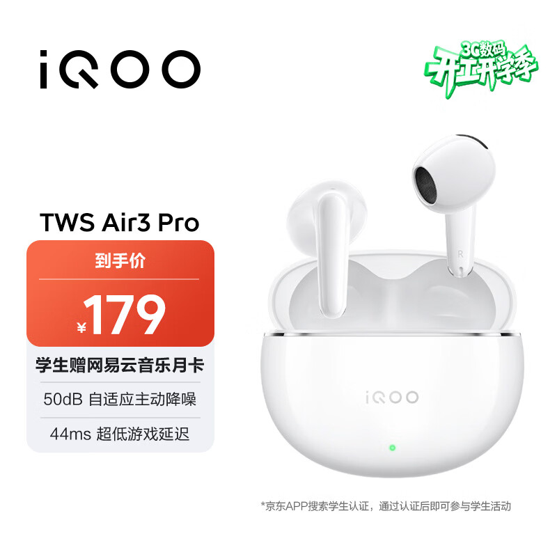 vivo iQOO TWS Air3 Pro 星钻白 50dB 自适应主动降噪 44ms 超低游戏延迟 47小时超长续航