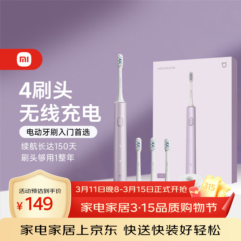 米家小米电动牙刷T302成人/学生150天续 4支刷头电动牙刷入门首选 生日礼物 送男友女友礼物