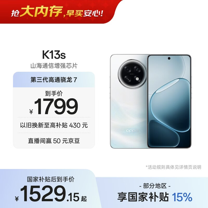 OPPO K13s 12GB+256GB 超能白 强悍更流畅 第三代骁龙7 抗摔耐磨 防水防尘 游戏千元新款手机 国家补贴