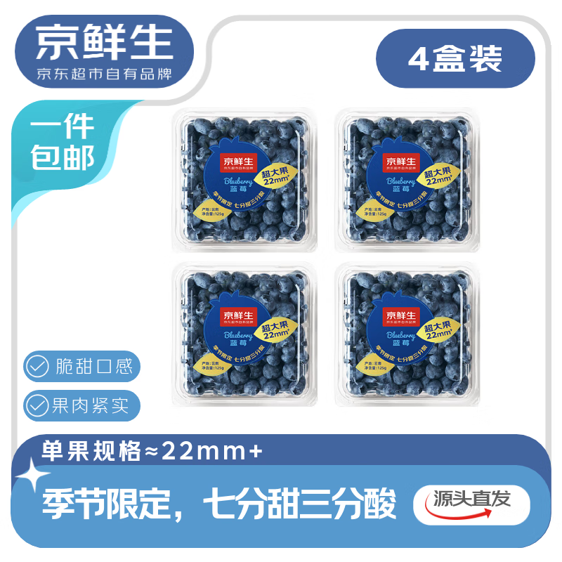 京鲜生 当季云南蓝莓 4盒超大果22mm+ 125g/盒 生鲜水果 源头直发 包邮