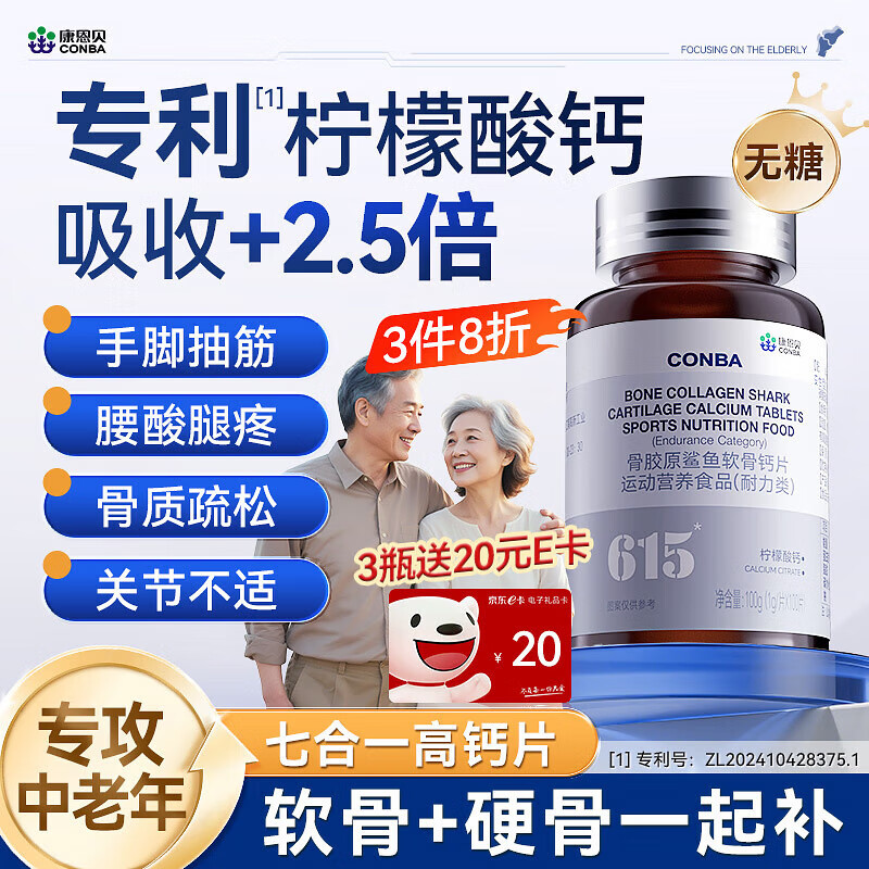 康恩贝中老年钙片补钙老年人腿抽筋腰腿疼骨质疏松50-60岁以上柠檬酸钙