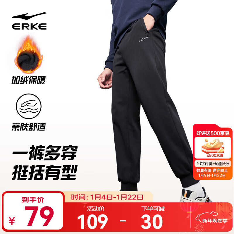 鸿星尔克运动裤男秋冬季新款加绒休闲针织束口长裤九分裤男士裤子卫裤男裤 正黑-1026-加绒针织 XL
