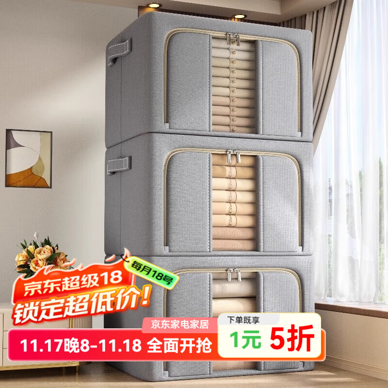 纳份爱衣服收纳箱家用布艺装衣物整理盒折叠衣柜筐袋牛津布储物箱子神器 星空灰66L【3个装-单窗】50*40*33CM