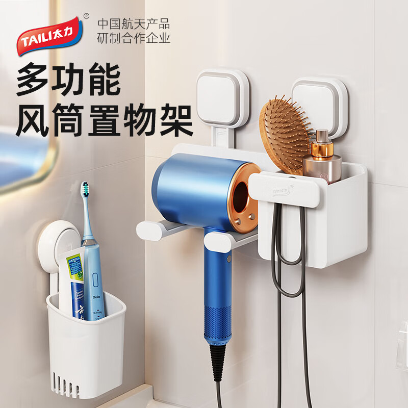 太力免打孔卫生间吹风机置物架浴室壁挂支架洗漱台挂架徕芬戴森通用 灰白吸盘风筒架【带收纳筒】