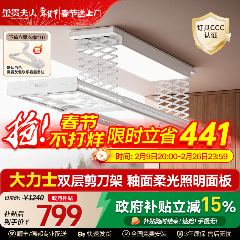 金贵夫人国家补贴电动晾衣架阳台专用自动升降智能晾衣杆隐藏式隐形晾衣机 A12双层剪刀架+釉面全屏灯