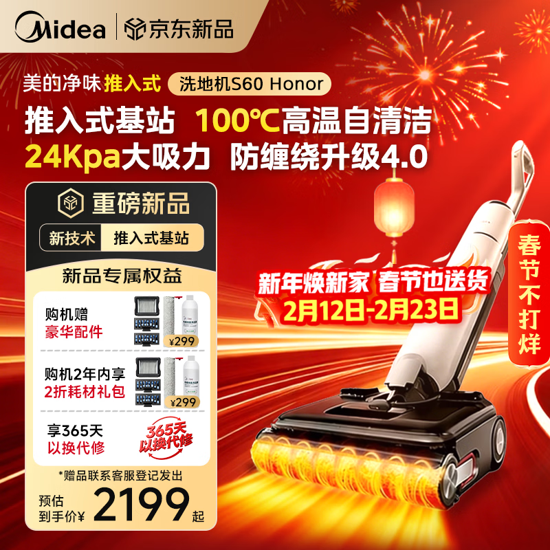 美的(Midea)推入式净味洗地机S60honor【2.5h闪电快充 24Kpa大吸力 全向助力】洗拖吸一体自动清洗 拖地扫地机